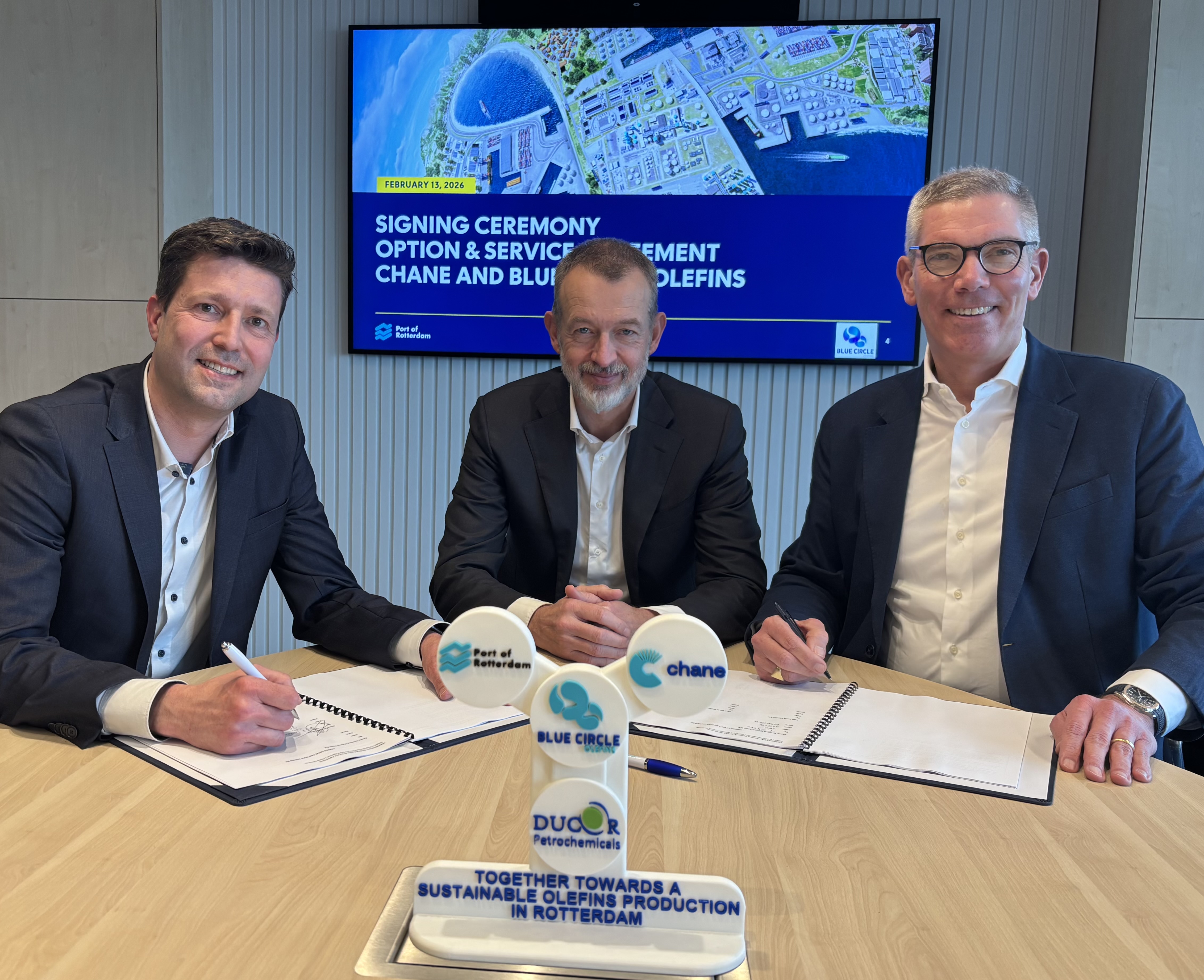 13 February, Rotterdam - Blue Circle Olefins and Chane have signed an agreement for co-siting and logistic services for its 200 kton olefins production facility at Chane’s Terminal Nieuwe Maas in the Port of Rotterdam. This agreement formalizes a strategic partnership between the companies and provides Blue Circle Olefins with an excellent location to develop the circular Methanol to Olefins (MTO) production facility in Rotterdam benefitting from Chane’s professional logistic services and storage facilities for, among others, renewable methanol feedstocks.